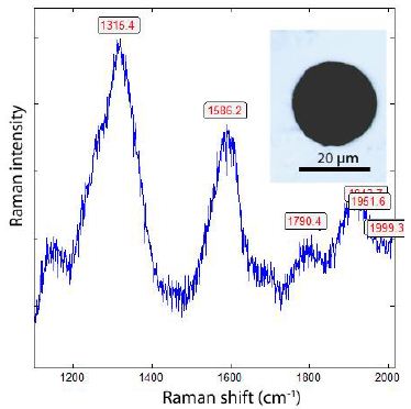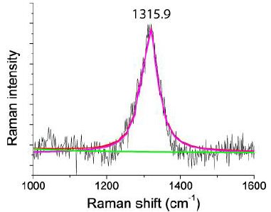 From both figures, we see the influence of laser energy on the sample. The diamond is black and obviously contains carbon. Therefore, the graphite band does not vanish completely. In Table 2 are some results arranged that show a developed, mostly strong graphite G-band beside the diamond band.