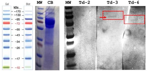 Figure 1: Results of the aptamer Western blots for the Td-2, Td-3 and Td-6 aptamers from Table 1 when used to probe 1.5M MgCl2 T. pallidum live cell extracts demonstrating that Td-3 binds a ~95 kD surface marker, while Td-6 binds a surface molecule closer to 72 kD and Td-2 does not appear to bind. These results correlate with the spectrofluorometric binding results presented in our recent aptamer-Fc opsonin paper in this same journal (doi.org/10.31038/IDT.2025613).