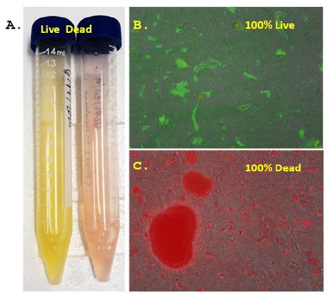 Figure 2: Macro (panel A) and microscopic (400X in panels B and C) results showing the differential green SYTO 9 fluorescent staining of 100% live 3 day T. pallidum culture and red propidium iodide fluorescent staining of 100% dead alcohol-treated T. pallidum cells using the Invitrogen BacLight™ Live/Dead assay kit.
