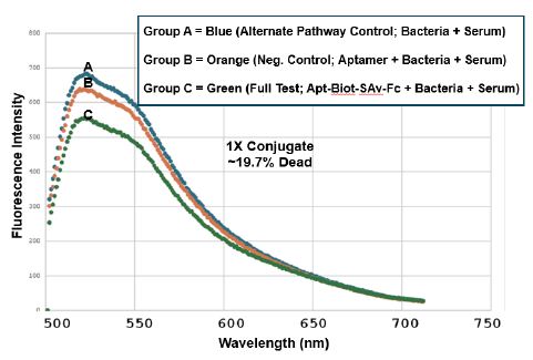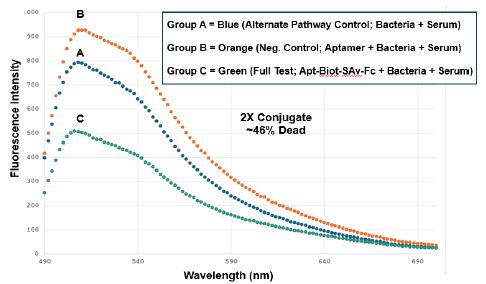 There is not much difference between groups A-C in the red (propidium iodide) region of the spectrum beyond 600 nm in any of the three spectrofluorometry trials (Figures 3-5), suggesting that we would not have seen much of a difference in the numbers of red- fluorescing cells by fluorescence microscopy in any event. However, as show in Figures 3-5, one can estimate cell death percentages by proportion of the fully live cell peaks for the A or B control treatment group spectral traces at 520 nm divided by the peak for the full test aptamer-biotin-SAv-Fc conjugate-treated groups and then subtracting the percent viable cells in the full test C group from 100% to obtain the percent dead cells (i.e., 100% – (100 x group C peak height at 520 nm/the taller of peak A or B height)). Using this formula, we obtained approximately 19.7%, 46% and 59% dead cells for the 1X, 2X and 5X 4: 1 aptamer-biotin to SAv-Fc conjugate concentration treatment groups respectively. The 5X amount (250 µl) of the conjugate is the practical volume limit for these in vitro experiments, thus the limit of killing for the aptamer-Fc conjugate approach is probably about 59% in the full test group C. Test group A was designed to assess the level of killing by mouse serum itself in the alternative pathway [8] while group B was designed to be a negative control to rule out killing of the bacteria by the aptamers themselves. Both groups A and B gave consistently high viabilities in all three conjugate dose trials while the full test group C demonstrated consistent concentration-dependent killing from 19.7% to 59% for the 1X to 5X conjugate doses in vitro.