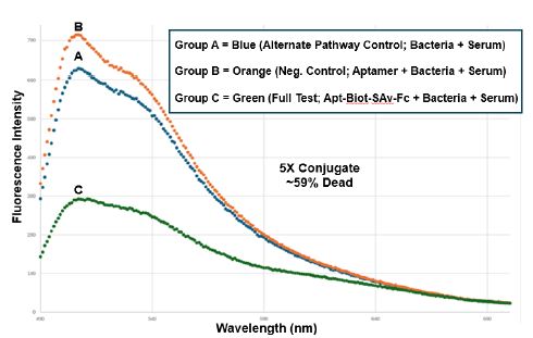 Figure 5: Trial 3 CML spectrofluorometric results using the 5X aptamer-Fc conjugate dose to achieve ~59% killing of T. pallidum as assessed by the BacLight™ Lived/Dead assay. Groups A-C are the same treatment groups as described for Figure 3. The 5X dose represents the practical volume limit for these CML experiments.