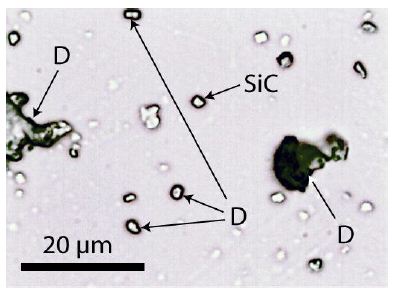 Figure 1: Diamonds (D) and silicon carbide (SiC) crystals after dissolving of grey cast iron in hydrochloric acid (25%) placed on a microscope slide.