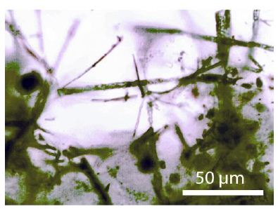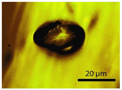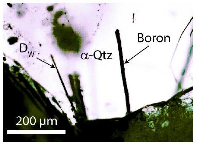 Figure 10: A mesh of diamond and boron whiskers in pegmatite quartz from Zinnwald. The black dot in the middle of the left side is also a diamond containing remnants of α- and β-boron [22].