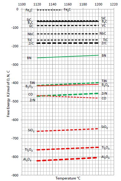 Figure 3b: A view on the free energy of various well-known metallurgy, oxides, nitrides, and carbides.