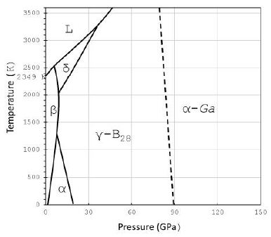 Figure 5: Schematic phase diagram of boron from Organov et al. (2009, 2010) [18-19]. The γ-B28 and α-Ga types are special high-pressure phases, which are not crucial in our viewing and are not important here. α, β, and δ stand for α-, β-, δ-boron; and L for liquid or molten boron.