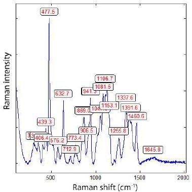 Figure 7: Raman spectrum of the boron crystal shown in Figure 6. The strong line 478 cm-1 is from the β-rhombohedral boron [15].