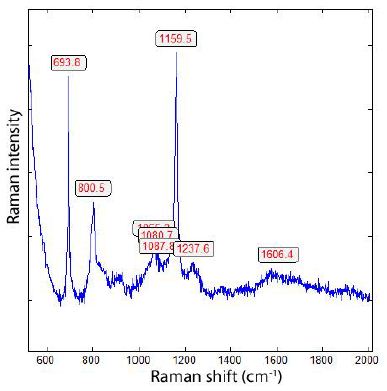 Figure 9: Raman spectrum of the boron needle in Figure 8. The bands at 694, 800, (1088), 1160, 2238 cm-1 are, according to Werheit et al. (2010) [15], typical for α-rhombohedral boron.