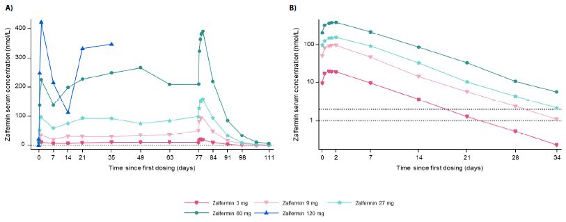 Vertical dotted reference lines represent first and last doses of zalfermin.