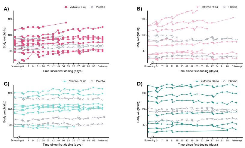 Figure 2: Change in body weight according to zalfermin dose over time: (A) 3 mg, (B) 9 mg, (C) 27 mg, and (D) 60 mg.