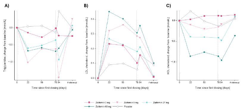Figure 3: Change from baseline in lipids: (A) triglycerides, (B) LDL cholesterol, and (C) HDL cholesterol after MADs of zalfermin in healthy participants.