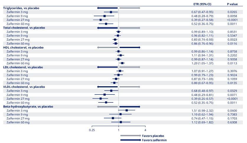 Figure 4: Estimated treatment ratios for change from baseline to end of treatment in lipids for zalfermin versus placebo.