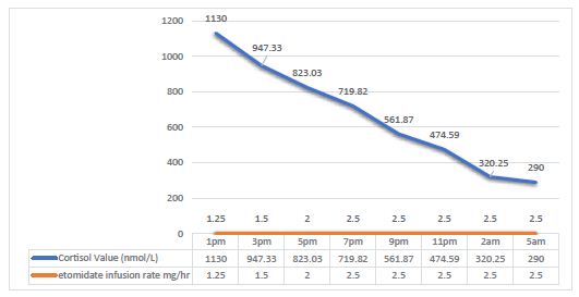 Patient’s serum cortisol levels were measured 2 hourly, aiming at a target cortisol level of <300 ng/dl. The etomidate infusion rate was slowly titrated to obtain a cortisol drop of around 100 nmol/l/hr.