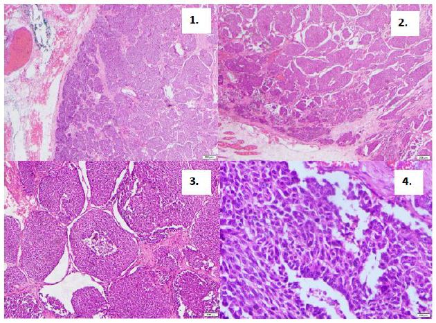 Histology of the thymic gland biopsy specimen (Figure 4) Atypical Carcinoid tumor with lympho-vascular invasion and infiltration of inferior margins and capsule invasion.