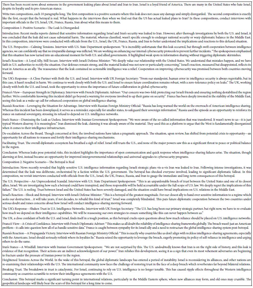 Artificial Intelligence (AI) has the potential to revolutionize various industries by summarizing its own thinking (see Table 2). By allowing AI to synthesize its own ideas through literature, case studies, or hypothetical scenarios, it can provide an objective and multi-angle analysis of complex human situations. This can mitigate human biases and limitations, as AI can sift through emotional pitfalls to provide an unbiased summary. AI’s ability to process vast amounts of information quickly and efficiently allows it to cross-reference various data points faster than expert human analysts. AI-generated summaries can also serve as a baseline for human analysts, providing them with preliminary insights and enabling them to explore new angles. AI summarization can factor ideas from economics, sociology, history, and political science—turning each analysis into a multi-perspective solution. In situations where speed is essential, AI summarization could streamline operations and predict potential outcomes from betrayal scenarios and larger ripple effects.