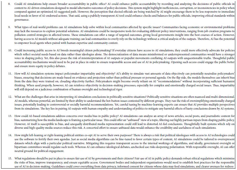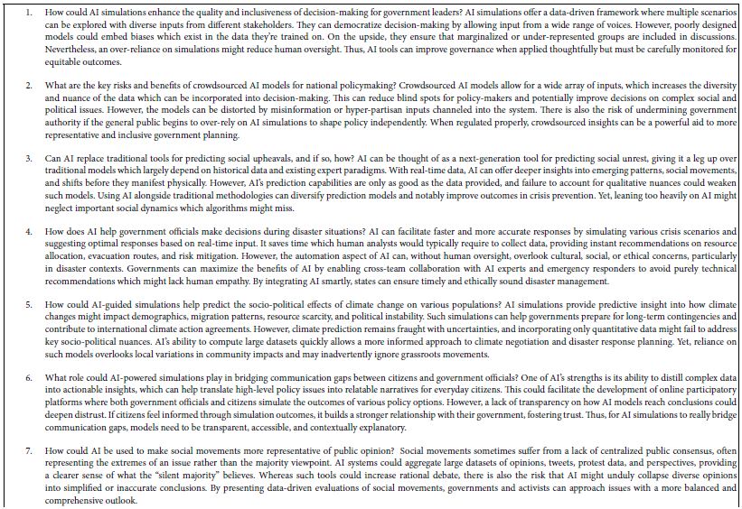AI has become an indispensable tool in problem-solving, idea generation, and critical thinking, particularly in personalized tutoring. It can serve as a thought partner, particularly in probing deep subjects like geopolitical issues. As demonstrated in Table 10, platforms like BimiLeap.com, for example, use AI as an autonomous knowledge giver and questioner, generating relevant questions and offering insightful answers based on defined topics. This allows users to delve deeper into geopolitical and strategic dimensions, enhancing their understanding and enabling them to think expansively. AI’s ability to ask complex questions that encourage users to delve deeper shows how AI-generated questions empower the “wisdom of the masses” in relation to key political and social issues.