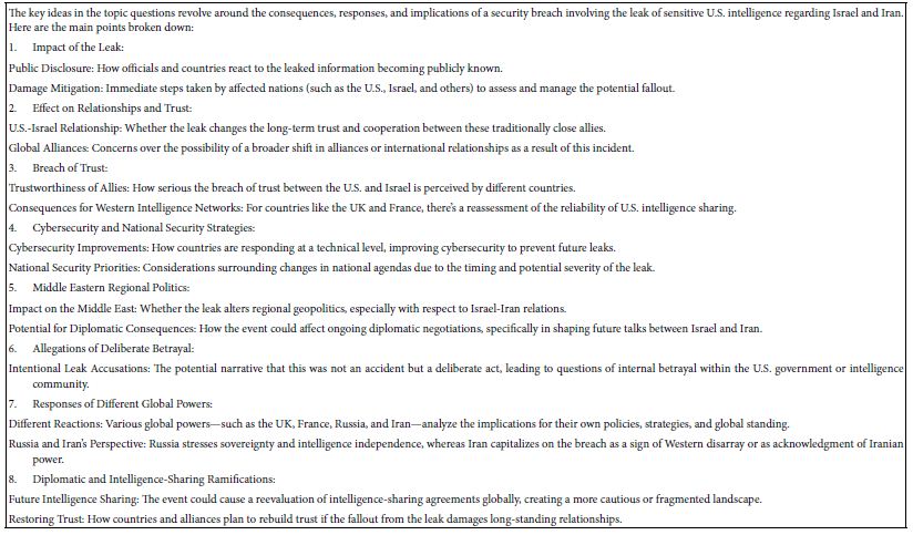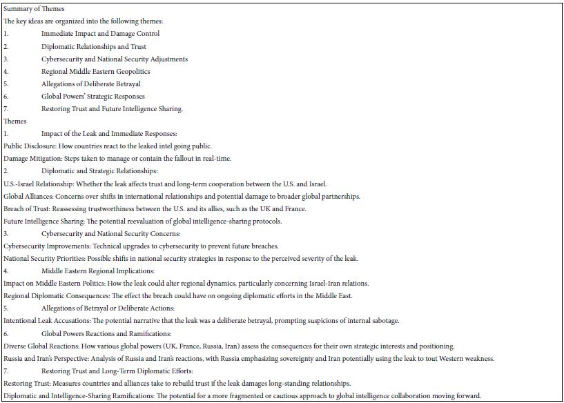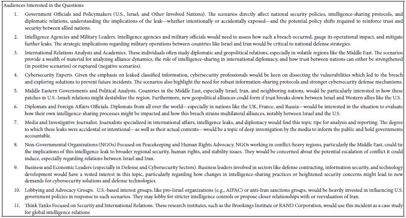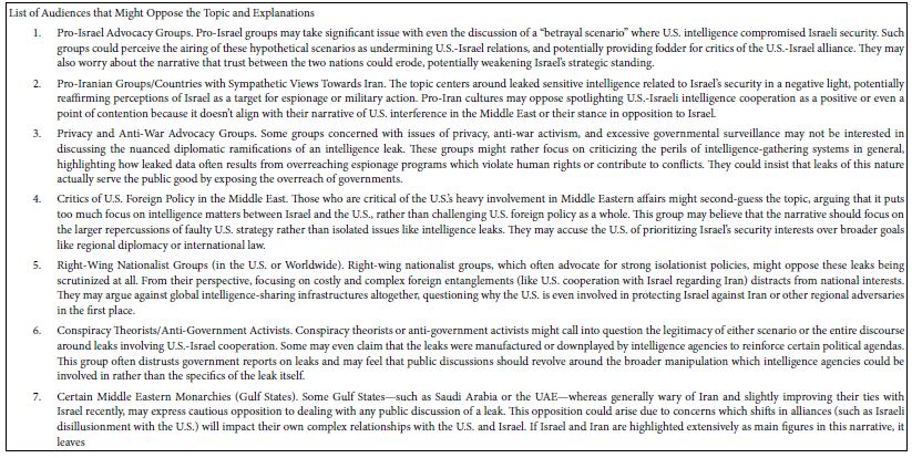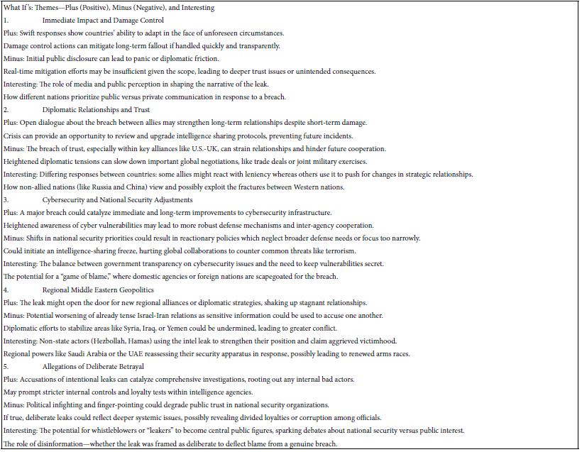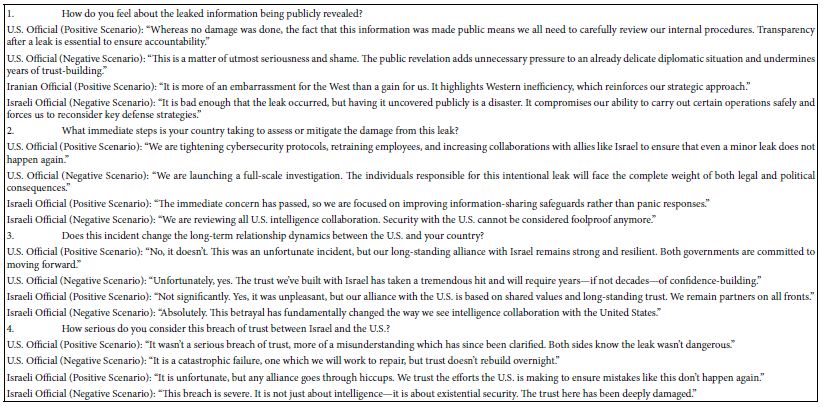 Artificial intelligence (AI) systems accessible through Idea Coach, the AI-linked feature of Mind Genomics through BimiLeap.com, can be used for simulation. The simulation, shown in detail in this paper, generates insights into real-world scenarios, such as the hypothetical “betrayal” by the U.S. sharing with others secret information which it had developed with Israel. AI is adept at synthesizing raw data and generating insights which mirror complex human situations, removing cognitive biases typically present when humans analyze scenarios emotionally. AI also excels at organizing complex networks of variables and ensuring cohesiveness, which is crucial when confronting intricate issues like geopolitics, national security, or international diplomacy [9-11]. AI’s ability to summarize and generate outcomes has real-world implications for organizations in sectors like government, law, business, or research. It can sort through thousands of variations, reporting back on probable consequences, best- and worst-case actions, and even unintended secondary effects from multiple perspectives. AI synthesizes ideas and combines knowledge from dispersed domains, allowing for imaginative, unexpected “mashups” of factors which human analysts might overlook [12].