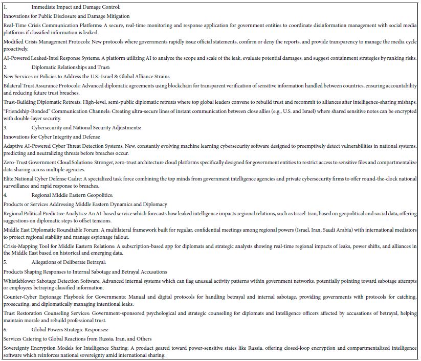 In the complex world of international relations, crises often arise from betrayals, misunderstandings, and unintended consequences. However, these moments of tension offer fertile ground for creative innovation. As leaders, thinkers, and innovators, we must shift our focus from crisis management to opportunity creation, focusing on the long-term possibilities and breaking the “fight or flight” mind-set. Every crisis contains the seeds of transformation within it, and entering a creative mindset allows us to repair and forge new paths simultaneously. By shifting focus towards innovation, we can capitalize on the opportunity created by temporary breaches and create a long-term vision built on creativity and strategic foresight. To create opportunities, we must re-examine the parameters driving the conflict and see the issues outside of their immediate context. This can lead to the emergence of fresh ideas and solutions which would not have been considered under more stable circumstances. Innovation often emerges most prolifically when the established order has been disrupted, allowing for new partnerships, novel strategies, and modernization (see Table 7).